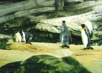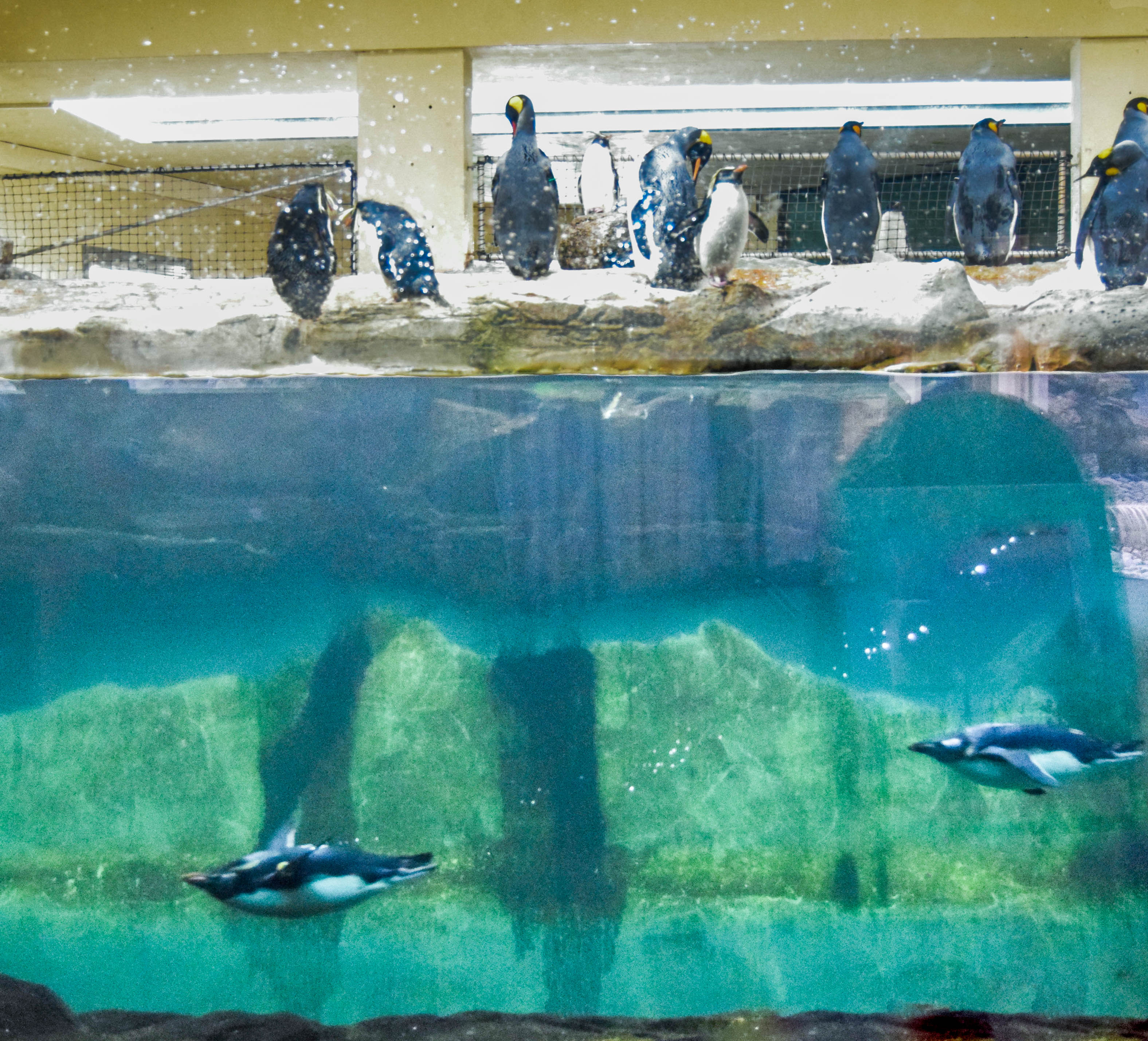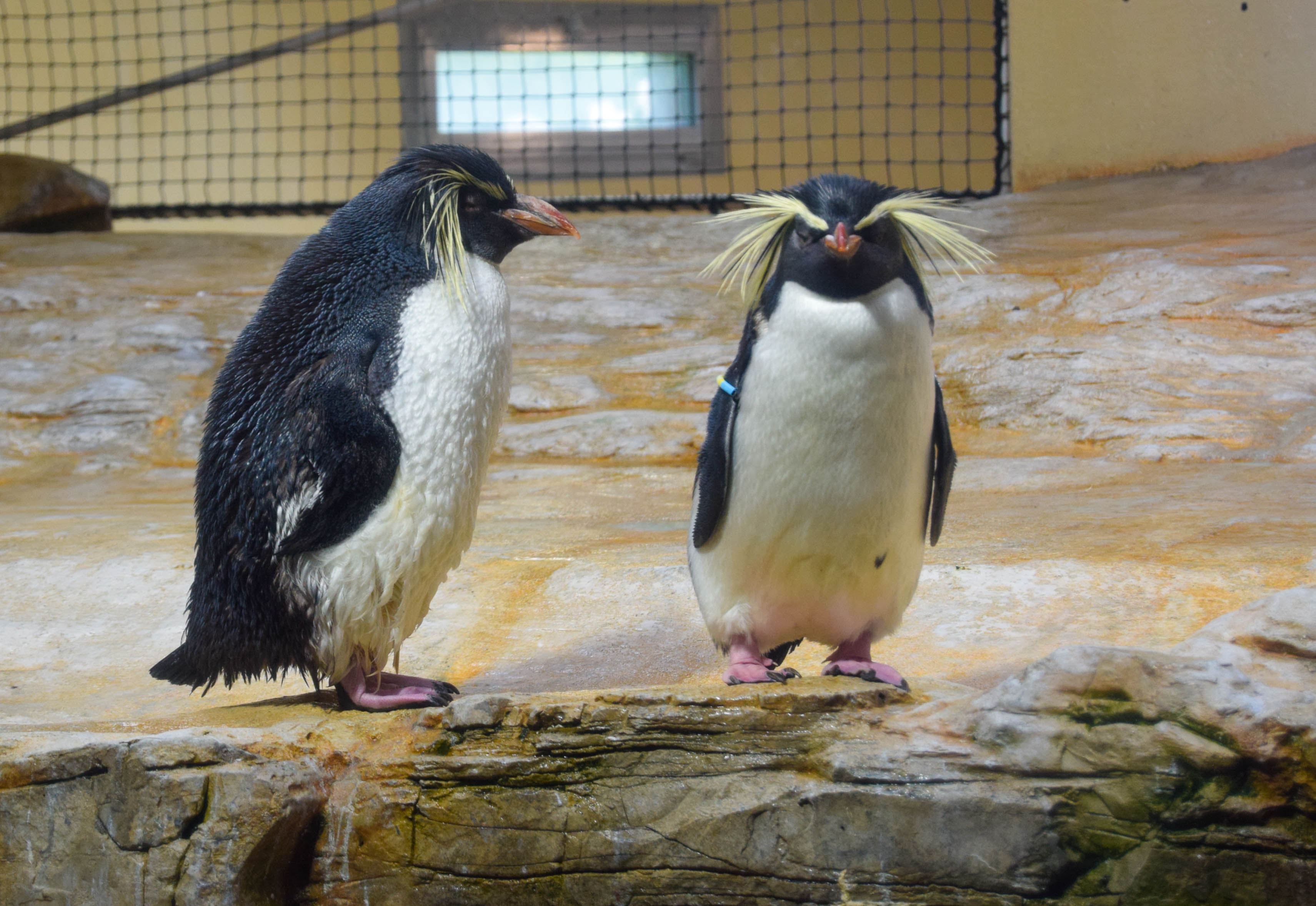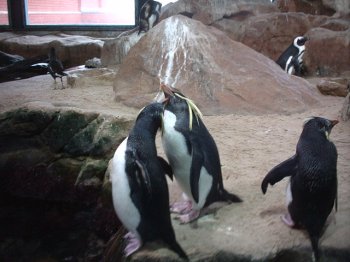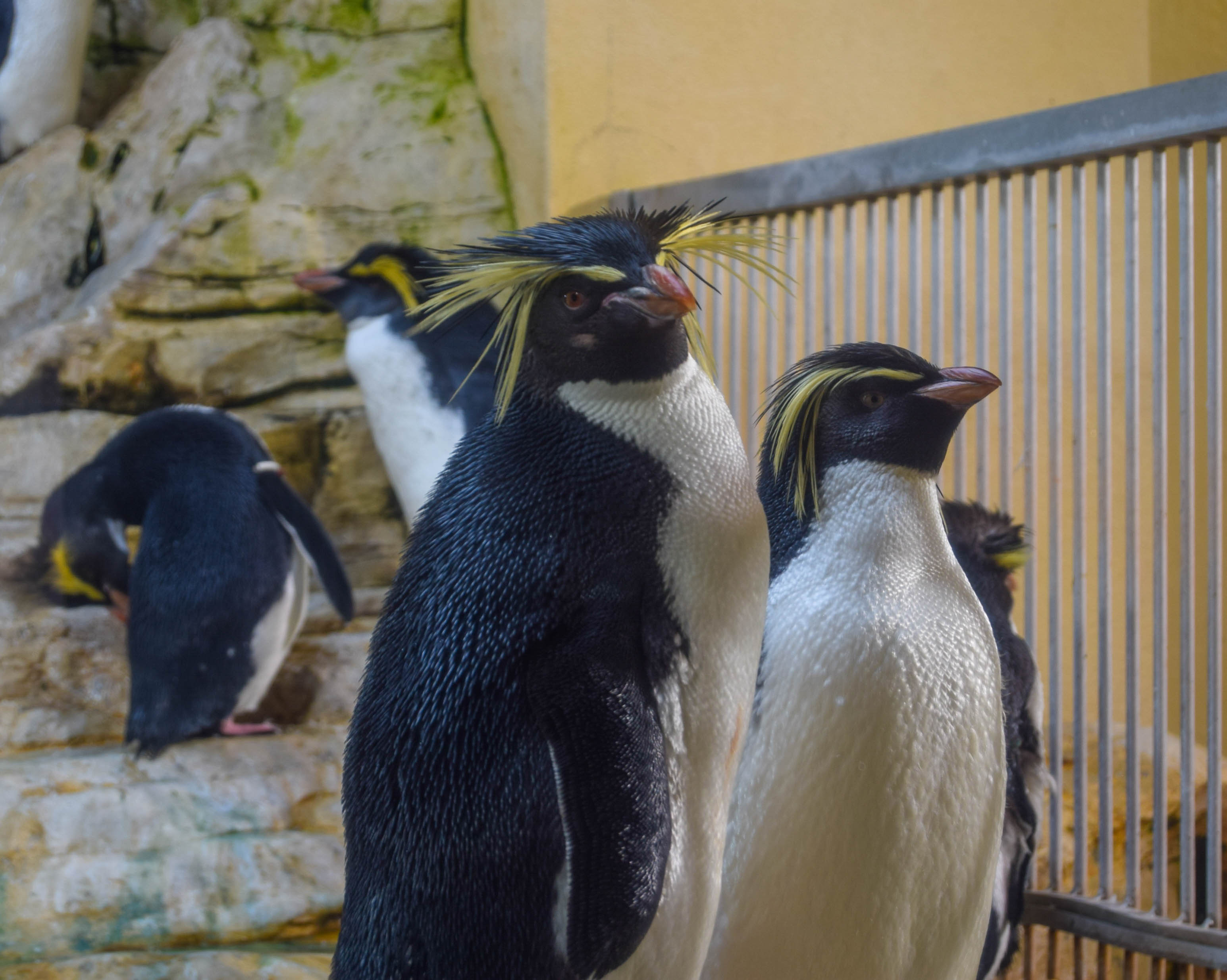 Four kinds of penguins in the Penguinarium: little, macaroni, king penguins and these rockhoppers. The rockhoppers right) have a yellow line above the eye.