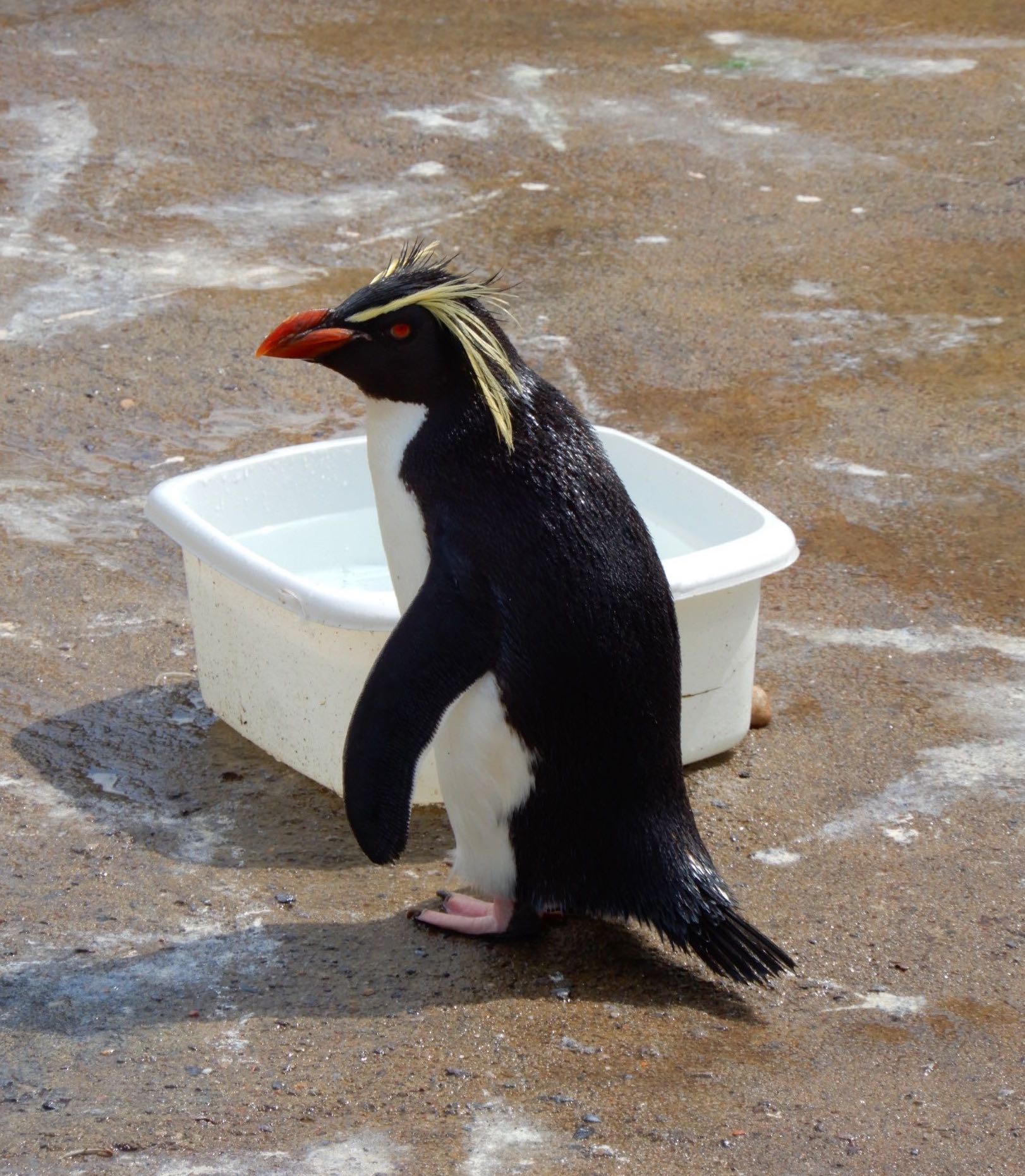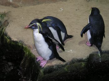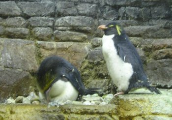 Edinburgh Zoo is one of the best in Europe for watching penguins. The Rockhoppers are together with King penguins and Gentoo penguins. The Rockhopers are of the northern kind: the long-tufted (Eudyptes chrysocome moseleyi).