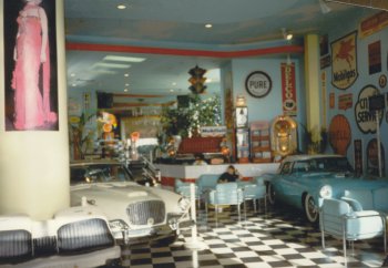 The Dezerland Beach hotel in Miami Beach (later a Howard Johnson and closed since about 2015) has a special lounge with cars from the 1950’s. Some of these are modified so you can have breakfast or dinner inside.